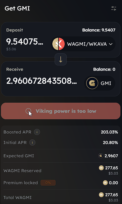 * **Premium Locked**: The premium percentage is calculated based on your choice of WLP, and the resulting premium is then added to your WAGMI balance.